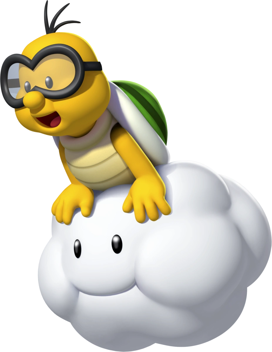 Lakitu is a Koopa Troopa with a green shell, orange, or yellow body, no beak, glasses with thick black frames, and is usually seen flying in a cloud bearing a smiling face.