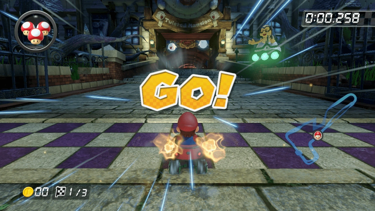 If the player taps the A button just as they hit the ground after Lakitu drops them onto the track, they can perform a recovery boost.